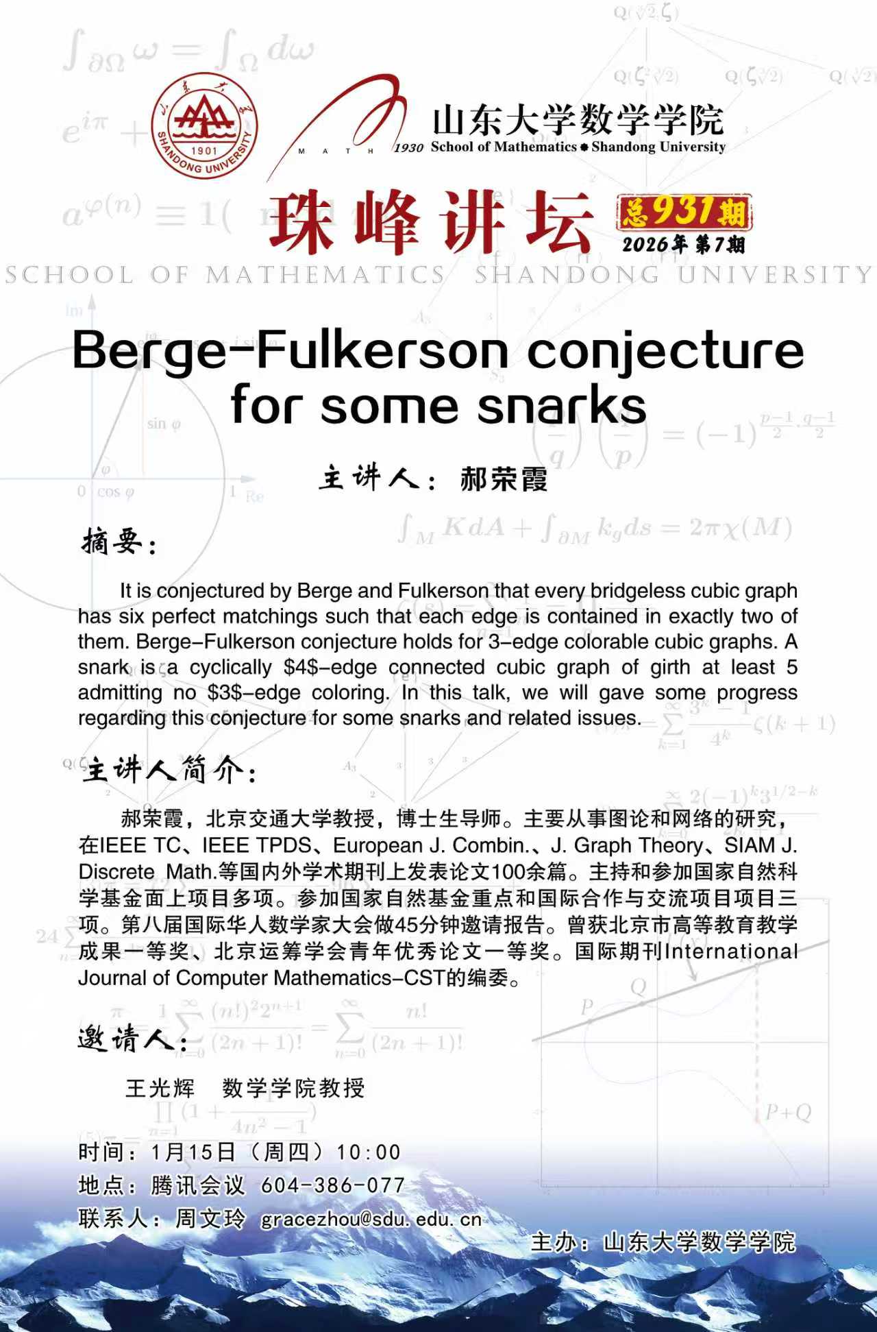 上一条:WilliamHill中文官方网站珠峰讲坛第932期:On the maximum diversity of intersecting families in the symmetric group