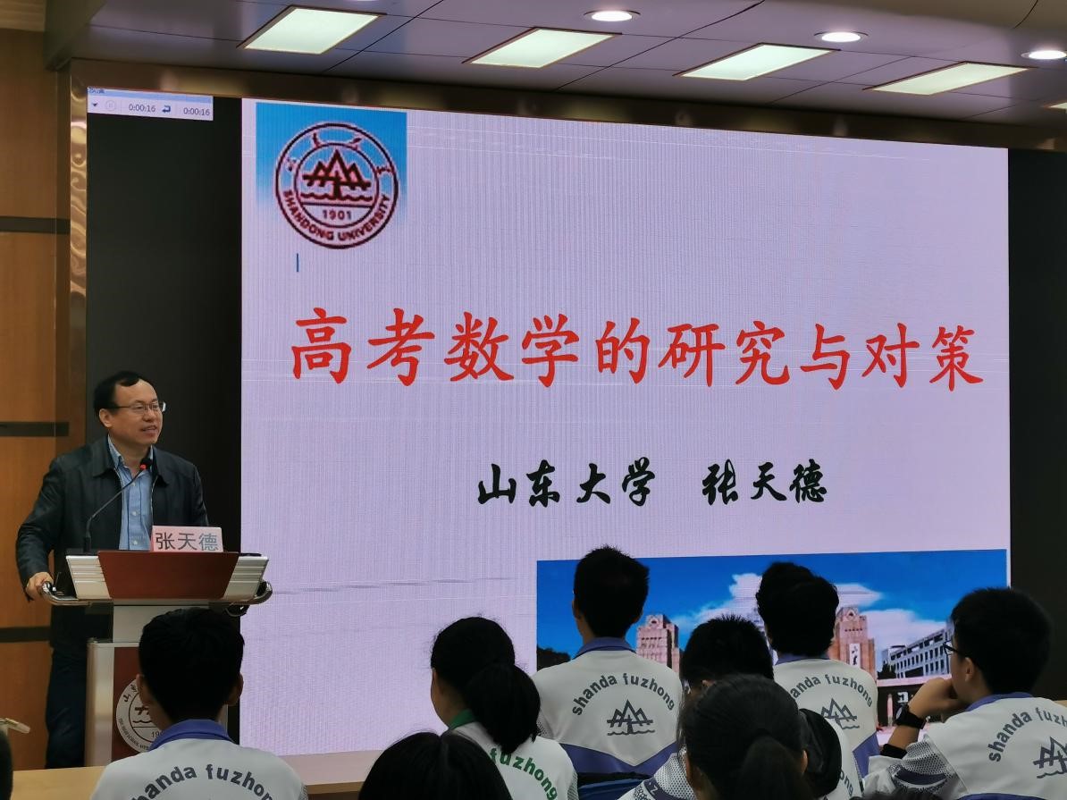 五位老师被山大附中聘为“济南山大实验学校与williamhill英国中文官网联合育人项目教授导师”。最后张天德老师为学子们带来一场专题讲座“高考数学的研究与对策”,对历年高考中的数学试题进行了分析、总结与指导,对改革后高考中的数学试题进行了探索、分析和预测,并跟现场的学子们进行互动。张老师的风趣幽默一次次将演讲推向了高潮,掌声不断。