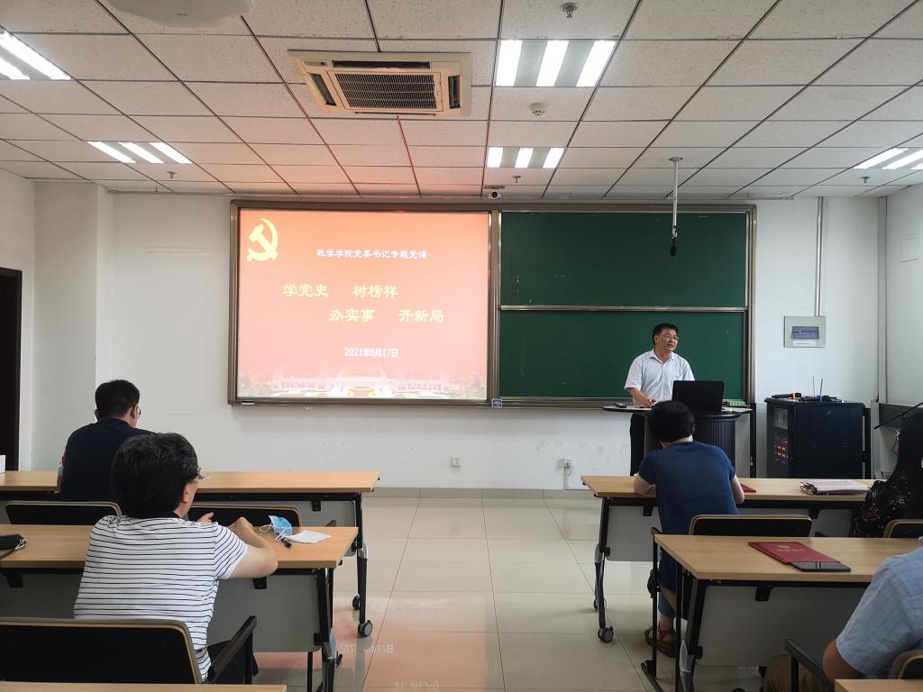 王光辉带来一节内容丰富、理论实践相结合的党课。他带领大家重温了中国共产党100年的奋斗史,要求党员干部深刻铭记党的光辉历程,深刻认识党的伟大贡献,系统掌握党创造的重大理论成果,学习传承党铸就的伟大精神,深刻领会党的宝贵经验,进而深刻感悟并践行党始终不渝为人民的初心宗旨。他结合学校“十四五”规划,希望全院党员干部,抓住机会,以山东应用数学中心、非线性期望前沿科学中心、山东省金融风险实验室三大高水平平台的建设与发展为契机,以国家重大战略需求为牵引,立足岗位、不断创新,充分开发大学科内部资源,齐心合力共谋“山大数学”这篇大文章,促进数学学科的快速发展。