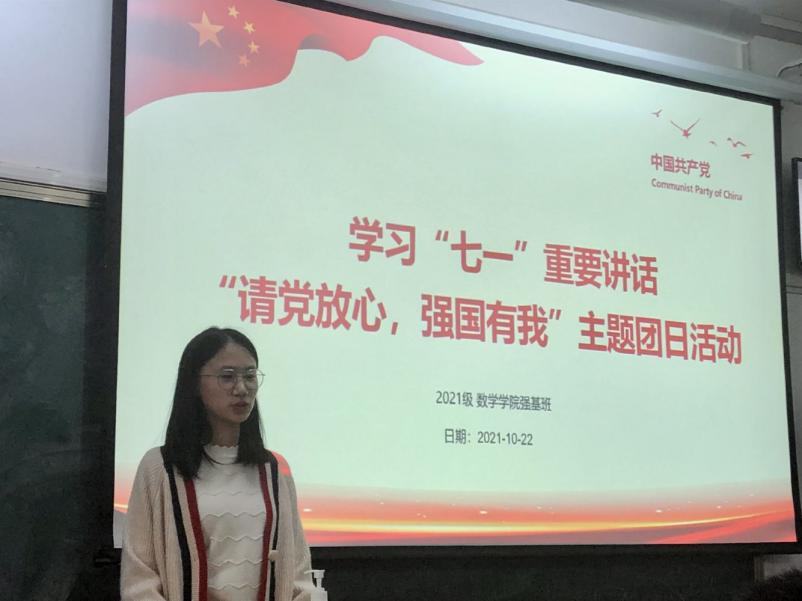 10月下旬,WilliamHill中文官方网站2021级新生以班级为单位开展学习习近平总书记“七一”重要讲话、党史的团日活动。一班、二班、华罗庚班和强基班分别开展“请党放心,强国有我”主题团日活动,深入学习了习近平总书记“七一”重要讲话精神及在“七一勋章”颁授仪式上的重要讲话精神,深刻理解了中国共产党及共产党人在国家复兴道路上的奋斗与牺牲。同时,每个班级也在主题团日活动中,设计开展了富有特色的学习活动。