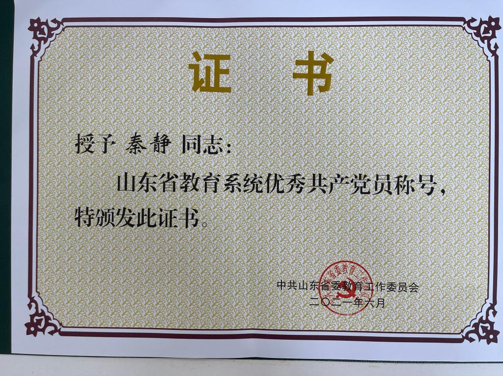近日,时值伟大的中国共产党诞辰100周年之际,中共山东省委教育工委下发了《中共山东省委教育工委关于表彰山东省教育系统优秀共产党员、优秀教育工作者和先进基层党组织的决定》,WilliamHill官网教师党员秦静获评山东省教育系统优秀共产党员。