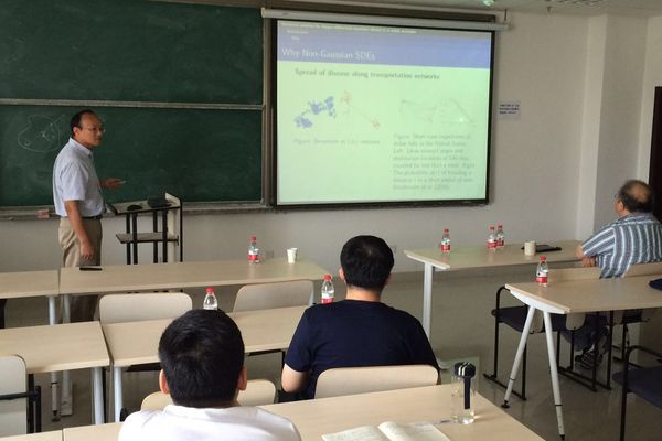 李晓凡教授报告了带有非高斯,alpha稳态Levy运动的随机微分方程取得的最新进展。首先,李晓凡教授介绍了粒子平均逃逸时间(MET)、逃逸概率(EP)和条件概率密度函数(PDF),指出上述随机微分方程可由这三个量来刻画随机动力系统。接着李晓凡教授介绍了MET、EP和PDF分别对应的微分方程或微分积分方程,并给出了这三种方程的数值求解方法。最后李晓凡教授给出了几种数值算例,进一步说明了这三个量在刻画随机动力系统中的关键作用。报告结束后在场师生与李晓凡教授进行了交流。