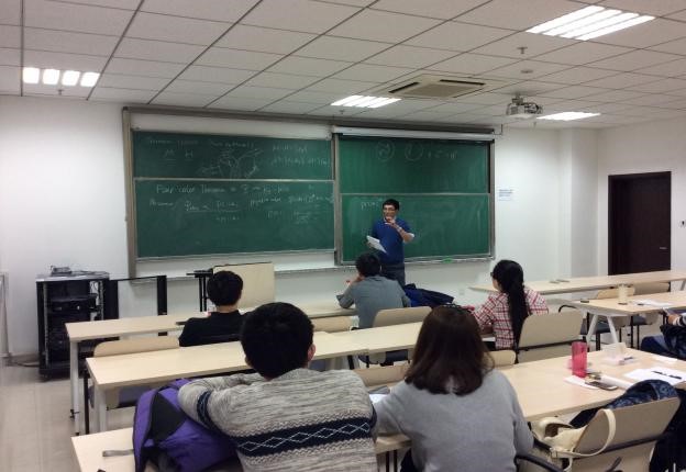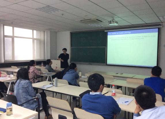 马杰教授介绍了在Ramsey数和Turan数的研究基础上提出的关于不在给定子图中出现的边的数目的问题。马杰教授从经典的Ramsey理论出发,引入了图的2-边染色下存在多少个k阶单色完全子图的问题,介绍了目前已有的研究成果和经典的方法。孙强博士介绍了一类平面图的同态问题,该问题是与著名的四色定理紧密相关的一类问题,并提出了当前该领域的几个公开问题,开阔了大家的视野。