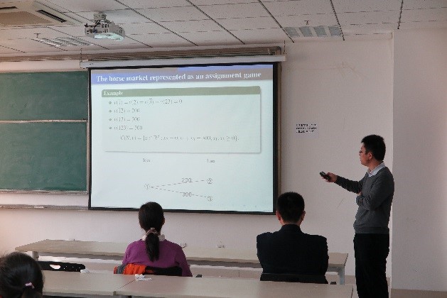 11月17日上午,中科院数学与系统科学研究所助理研究员曹志刚受邀来到williamhill英国中文官网,作了题为《Shapley’s Conjecture on the Cores of Abstract Market Games》的学术报告。williamhill英国中文官网运筹学与控制论研究所所长吴建良教授主持了该报告会,WilliamHill中文官方网站王光辉教授及运筹学方向的研究生参加了此次报告会。