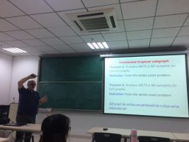 在此次报告中,Yannis Manoussakis教授主要介绍了他在点染色图的tropical结构方面所做的一些工作。首先,他由四色问题、寻找正常树、tropical分支等背景知识作为引入,通过图形生动形象地给老师和同学们介绍了tropical及相关定义。接着,他介绍了研究点染色图的tropical结构的动机:它在网络图、生物信息学、社会科学方面都有着广泛的应用。然后,Yannis Manoussakis教授从三个部分给大家详细讲解了他的团队所做的具体问题和结果,分别是:PART 1 Tropical Connected Dominating Sets;PART 2 Tropical Connected Components;PART 3 Tropical Matchings。详细的讲解过程让老师和同学们对这些问题有了更深刻的理解。在提问环节,老师和同学们讨论热烈,Yannis Manoussakis教授一一解答了大家的疑问。