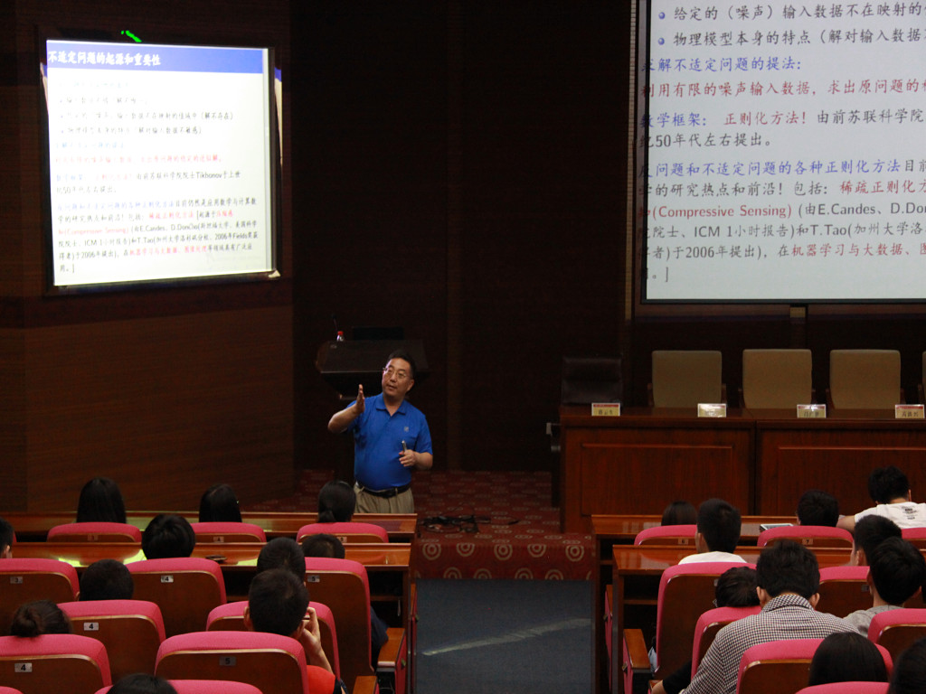 报告伊始,张波首先用通俗的语言阐述了反问题的概念,指出反问题是相对于正问题而言的,没有绝对定义。接着他提出反问题的解的性质比对应的正问题更加困难,阐明了研究此类问题挑战性。同时,他指出反问题求解未知量和通常的正问题有所不同,引发同学们深思。随后,他对什么是不适定问题以及不适定问题的条件和进行了讲解,深入浅出地对这个问题进行了深刻的阐述。最后他指出反问题主要有三个方面的应用,分别是:医学成像(例如核磁共振成像),电阻抗成像和反散射问题,并且通过生动有趣的方式讲解了反问题研究领域的主要成果和最新进展,得到了同学们的热烈掌声和激烈讨论。