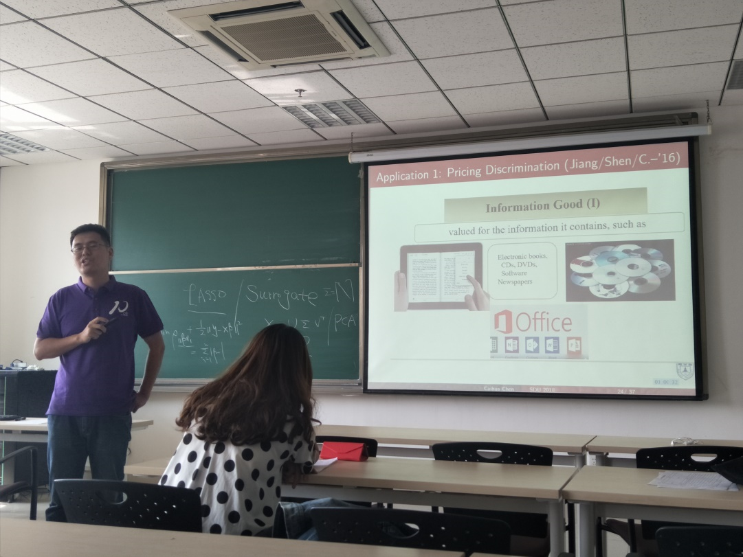 陈彩华首先从高维数据分析开始讲起,他指出对高维数据本身的分析是十分困难的,但是可以通过某些方法将其分解为多个低维的问题,从而降低分析的困难,使分析变得更简单。之后陈彩华教授着重讲述了最优化理论、算法与应用,他表示对于多元复杂问题,可以通过固定其他变量,从而简化问题,进而求出目标变量的方法,这与之前的高维数据分析有异曲同工之妙。最后陈彩华教授又简单讲解了一下计算机管理,以光碟的销售为例,通过计算机建模,分析消费者的需求以及其他各项因素,从而得到光碟销售的经验。