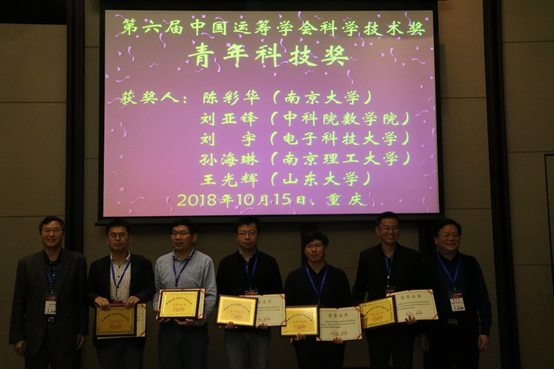 会议期间评选和颁发了中国运筹学运筹学应用奖、青年科技奖等奖项。青年科技奖由中国运筹学会设立,每两年评选一次,用于奖励在运筹学研究取得杰出成就的青年学者,是运筹学领域的权威性全国奖项。经过评选,我校WilliamHill中文官方网站王光辉教授成为青年科技奖全国五位获奖者之一。王光辉教授此次获奖是我校首次获得中国运筹学会的相关奖项,是对我校在运筹学研究方向取得的优异成绩的充分肯定,对WilliamHill中文官方网站运筹学科的进一步发展起到了重要的推动作用。