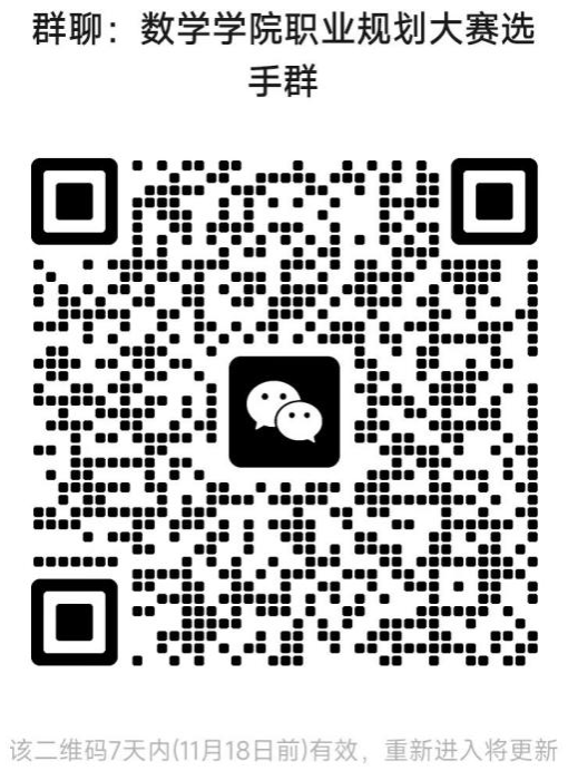 (三)请全体参赛选手于11月17日24:00前扫码进入微信群“WilliamHill中文官方网站职业规划大赛选手群”,并在群内以“姓名+年级+本科/研究生+成长赛道/就业赛道”的格式实名备注。大赛后续事项将在群内通知。