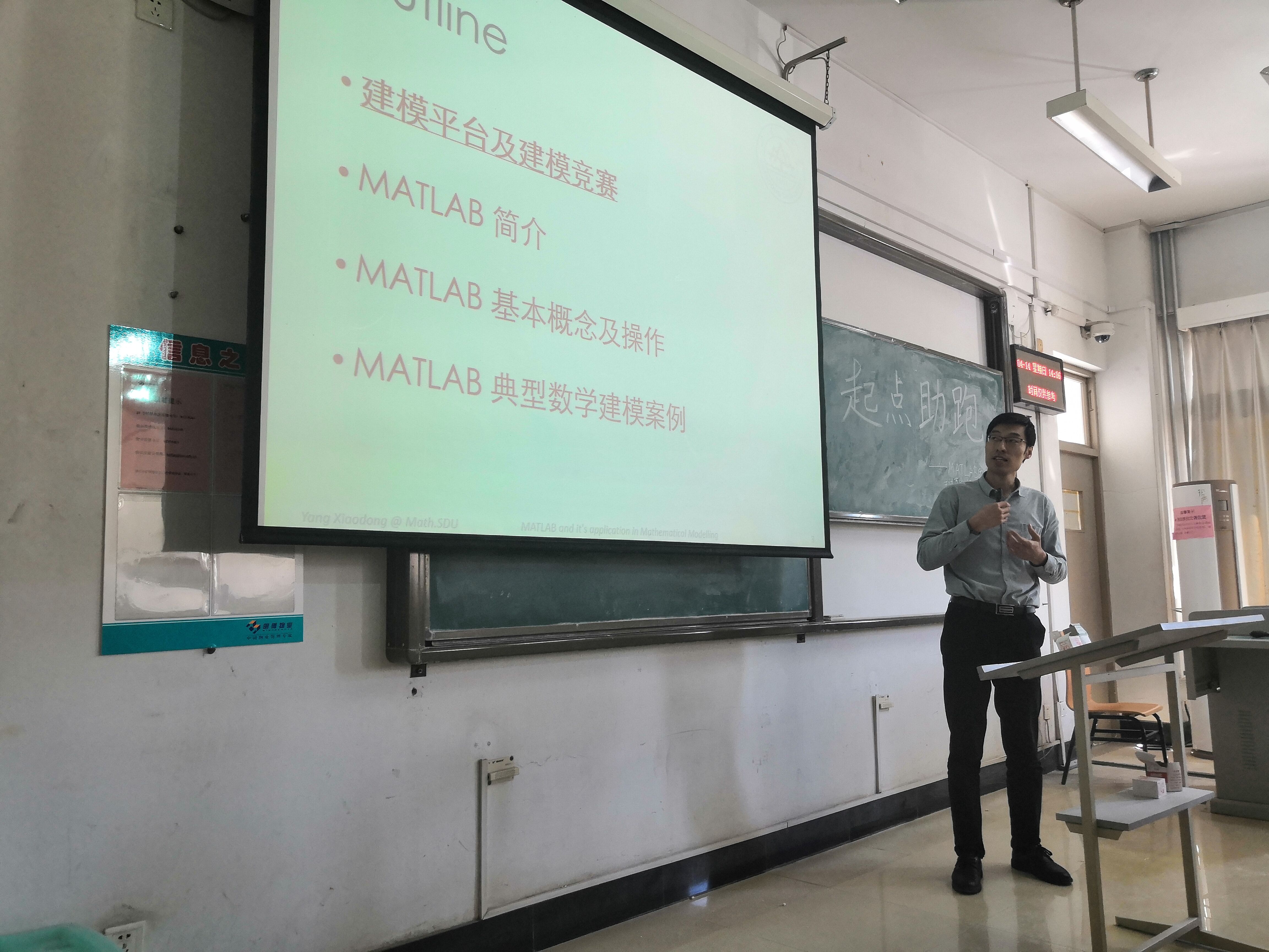 数学建模协会于4月14日下午2:00在E5206d教室开展了起点助跑系列培训讲座之论文写作,这次讲座中我们邀请到了杨晓东老师作为特约嘉宾,全体数学建模干事以及部分感兴趣的同学们都参加了此次讲座。此次讲座旨在为同学们介绍matlab使用的方法、技巧、相关工具加深同学们对于matlab的理解,为日后的数学建模比赛中模型建立奠定基础。