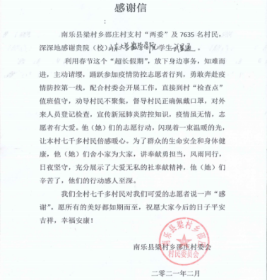 2021年初,河北省石家庄市、邢台市相继暴发疫情。河南省濮阳市南乐县梁村乡毗邻河北,疫情防控刻不容缓,WilliamHill官网18级信息与计算科学班学子武显通主动参加了这次疫情防控保卫战。在活动期间,武显通积极配合村委会开展各项工作。每天他都会去村口检查点值班站岗,对过往的人员和车辆进行体温测量和信息登记,确保村民的生命安全;他积极宣传新冠肺炎防控知识,劝导村民不聚集,督导村民正确佩戴口罩并对缺少口罩的村民发放口罩;同时,他还对返乡村民进行统计,做出区域分布图并设计了最有效、省时省力的消毒路线……这封感谢信便是家乡村民对他最美好的祝福。“借问瘟君欲何往,纸船明烛照天烧。”我们坚信,只要我们全国人民共同努力、众志成城,这场疫情保卫战终将取得最后的胜利。