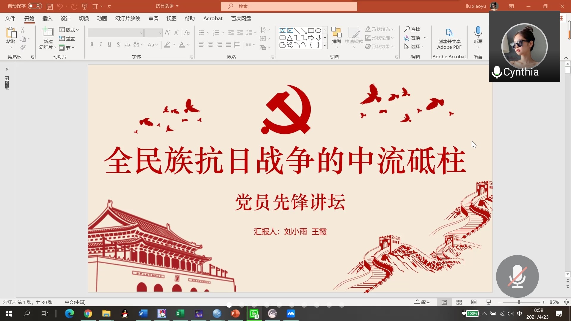 首先,刘小雨、王霞进行了以“全民族抗日战争的中流砥柱”为主题的党员先锋讲坛,介绍了中国共产党在抗日战争中的中流砥柱的作用。今年是中国共产党成立100周年,通过讲解学习,同学们认识到作为新时代的青年人,要充分认识到党史学习的重要性,做到知史爱党,知史爱国,学好党史,增强使命感和责任感。