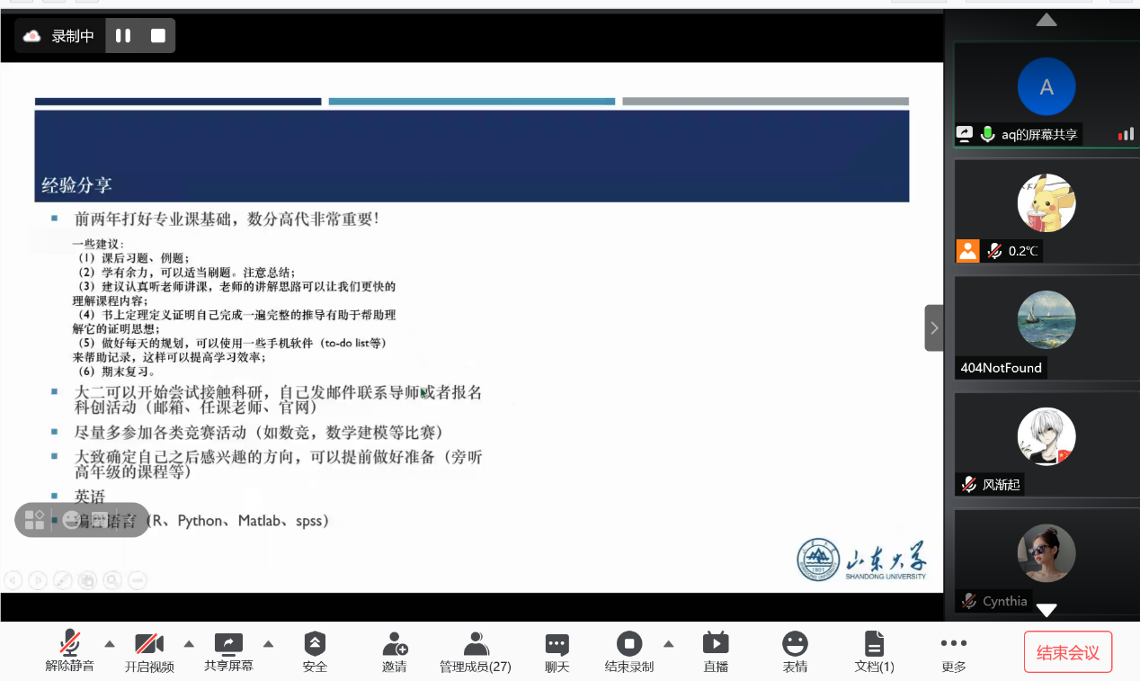 随后,谢琪娜向大家分享了专业学习经验。她提到要打好专业课基础,并趁早尝试接触科研,多参加竞赛活动,注重英语的学习。通过分享同学们纷纷表示作为第一届强基计划本科生,担负着独属于自己的时代使命,要更加努力学习,尽早成长为国家基础学科的专业人才。