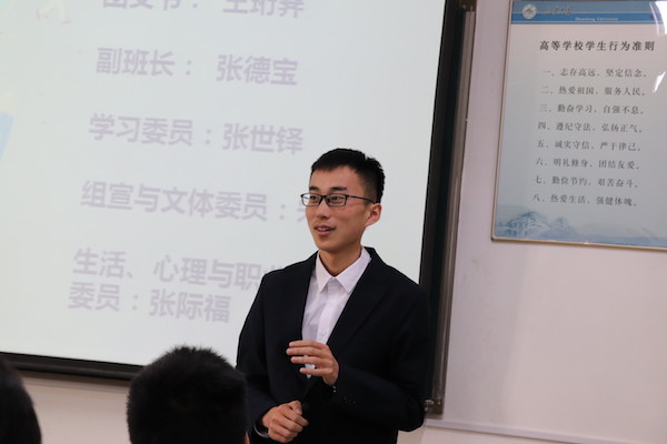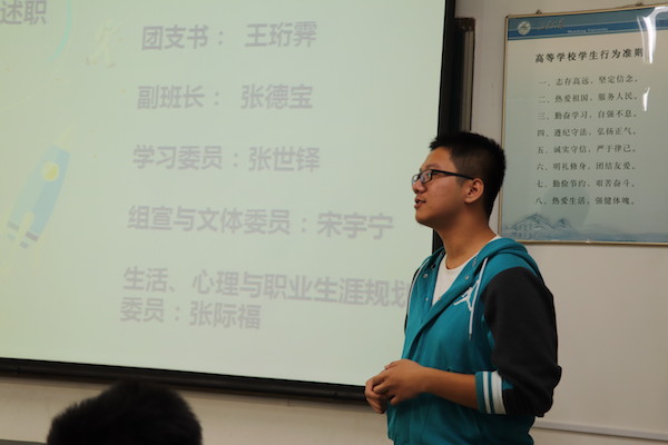 班会伊始,团支书王珩霁向同学们致谢,欢迎同学前来参加2015级信息安全班成立以来第一次班会。气氛轻松活跃,随后班长孙宇阳为大家介绍了班级中的成员组成,以及班委对口宿舍的管理制度,并邀请各个班委依次上台为大家做了简短风趣的自我介绍。接下来是游戏时间,全班同学分组上台表演你划我猜,在精心挑选的词汇下,大家滑稽的动作使得教室里洋溢着欢乐的气氛。随后,张玲教授就同学们最为关心的毕业去向就业形势的问题为大家做了简短的介绍,勉励同学们只要努力学习,就一定能够实现自己的人生目标。