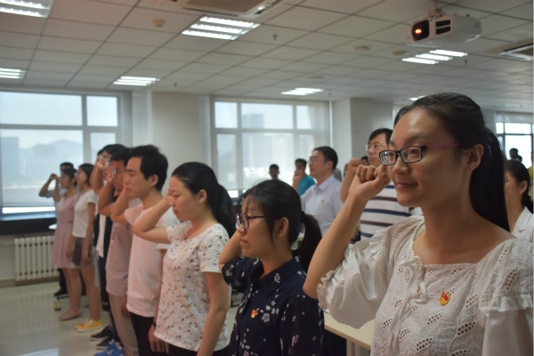 新党员宣誓仪式在《国际歌》声中拉开了序幕。全体党员举起右手,面向党旗庄严宣誓,响亮的宣誓声萦绕在教室,表达了全体党员坚定的入党信念和为共产主义奋斗终身的决心。与会老党员与新党员一同宣誓,重温入党誓词。