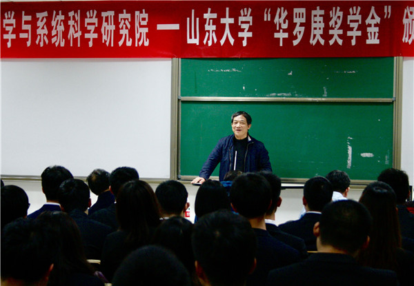 颁奖仪式后,华光先生在《我的父亲华罗庚》专题讲座中深情讲述了父亲华罗庚先生的伟大一生。在讲座中,他多次提到勤奋的重要性,“聪明在于勤奋,天才在于积累”。华光先生还引用华罗庚先生所言“宇宙之大、粒子之微、火箭之速、化工之巧、地球之变、生物之谜、日月之繁,无处不用到数学”,向同学们说明数学是取之生活而用之生活的,希望同学们在学好数学基础的同时学以致用,做一个有利于社会、有利于国家的人。中科院的各位嘉宾和老师还在典礼之后举办的“我与数学家面对面系列访谈”活动中,与获得华罗庚奖学金的同学们进行深入座谈,共同畅谈数学研究感悟并为同学们答疑解惑;巩馥洲在座谈中着重强调学术态度与科研方向,希望同学们能够“不忘初心”,诚恳认真地对待自己心中最初的理想,在数学道路上砥砺前行。同时,张波教授还做了关于逆散射法理论与计算的学术讲座。