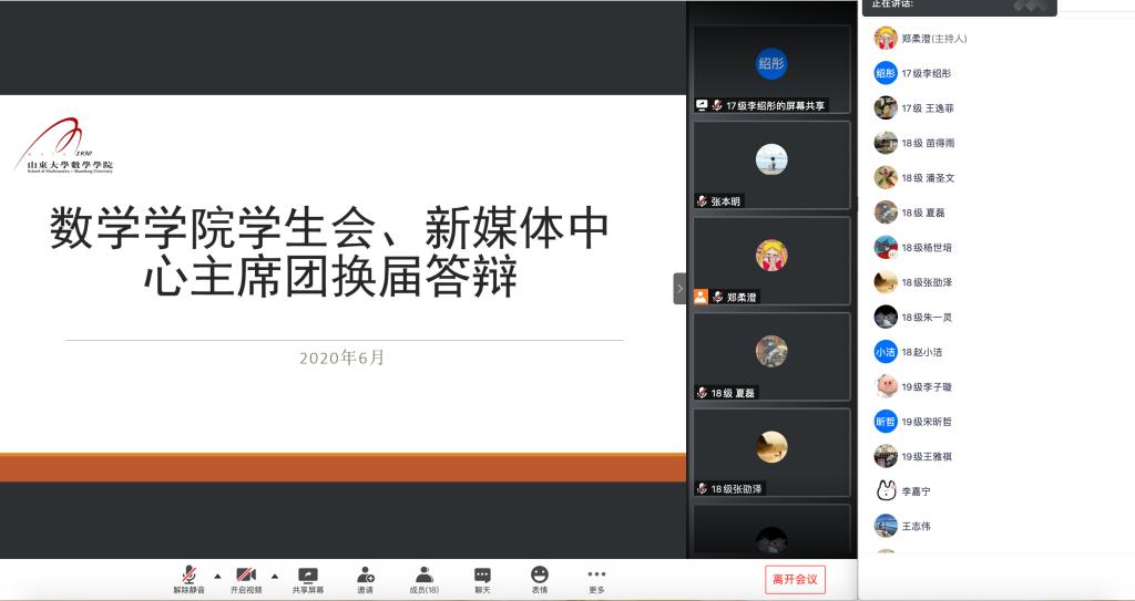 2020年6月13日下午2:30,WilliamHill中文官方网站学生会、新媒体中心举办主席团换届线上答辩会。WilliamHill中文官方网站党委副书记路云生,班主任老师王志伟,团委老师郑柔澄、张本明及现任主席团同学们担任评委,10名同学参加答辩,部分同学观摩学习。