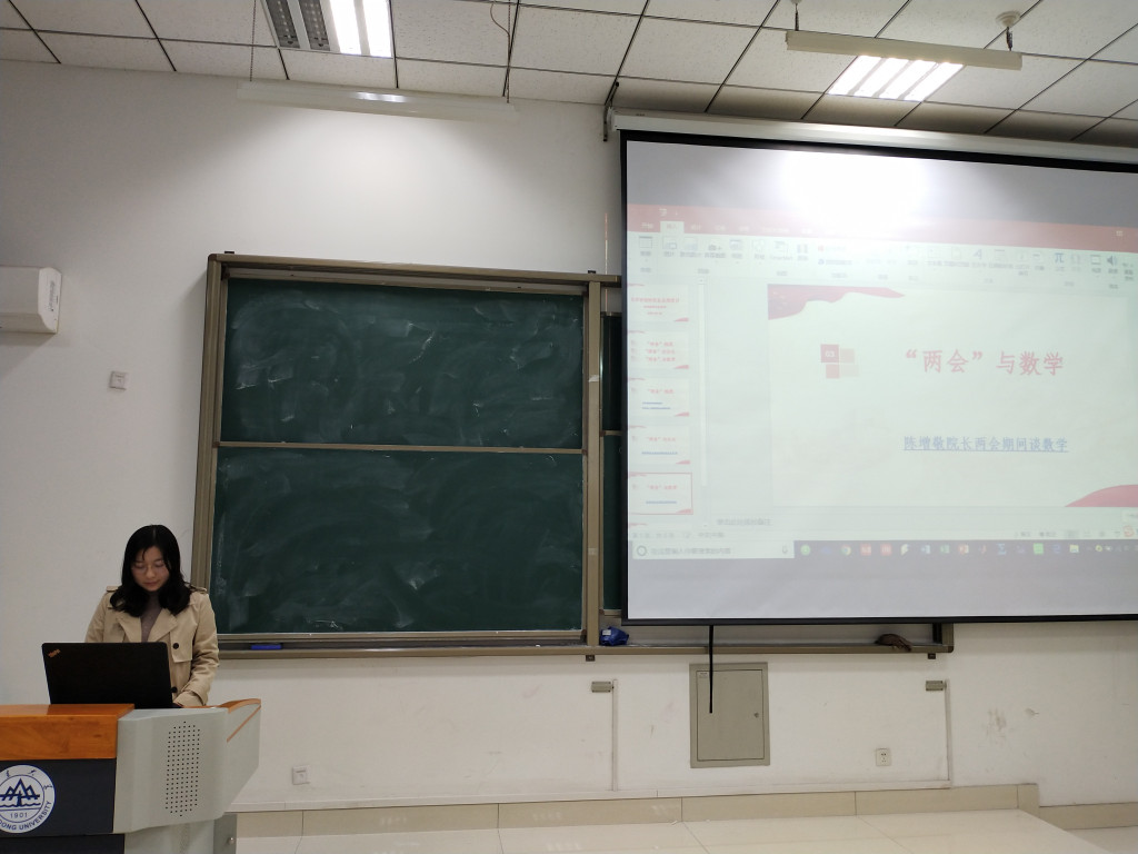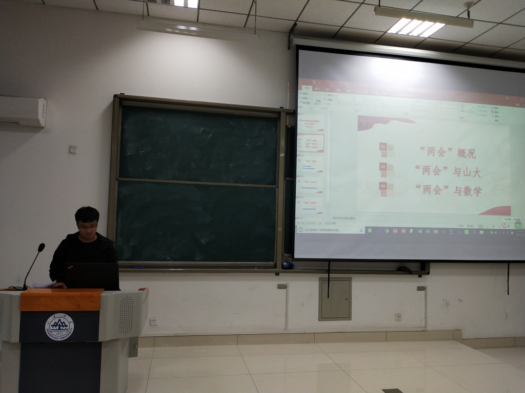 本次会议分为“两会”概况、“两会”与山大以及“两会”与数学三个部分。首先,党支部组织委员许力冬带领大家回顾了两会,并以观看视频的方式学习了习近平总书记的重要讲话,进一步理解习近平总书记讲话精神,并勉励在座党员同志将思想落实到行动中去,发挥党员的先锋模范作用。随后,杨海宁展示了全国人大代表、williamhill英国中文官网校长樊丽明做客人民网两会“高谈客论”栏目的视频。樊校长在接受采访中表示,williamhill英国中文官网将着力打造“山大系”品牌,以经济社会发展需要为导向,积极推动科技政策实施,大力开展科技成果转化,以共建专业研究院等平台的形式加强校地合作,推动校企合作,打造新的经济增长点,促进新兴产业集群,构建产教融合良好生态,更好地服务山东发展。在座党员同志听完樊校长的讲话之后,备受鼓舞,对williamhill英国中文官网迈上新的台阶充满信心。最后,党支部宣传委员王悦带领大家观看了全国政协委员、williamhill英国中文官网和金融研究院院长陈增敬在两会上的发言,陈院长提出可以通过构建社会福利体系,达到先富帮助后富的基本要求,起到收入调节和社会公平调节的作用,做到脱真贫、真脱贫。同时,他也指出,可以通过金融产品实现投资主体多元化、服务对象公众化、运营方式市场化,进一步提高福利体系的层次和水平。陈院长的发言让党员同志们真正体会到学以致用的魅力,坚定了学好数学的决心。