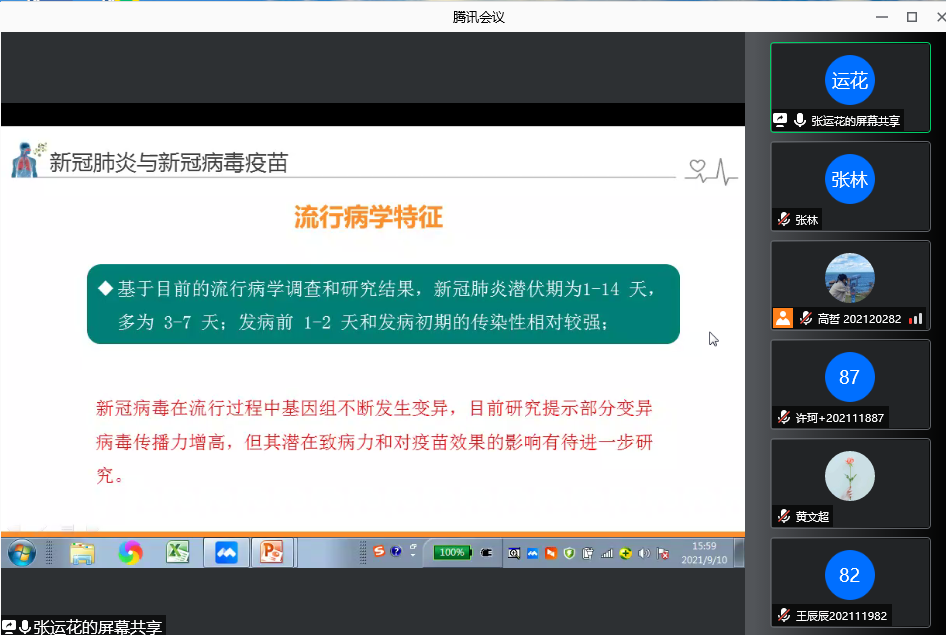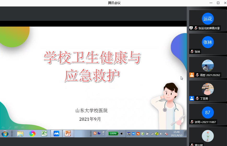 2021年9月10日下午,“学校卫生健康与应急救护”健康教育讲座于腾讯会议线上举行,由williamhill英国中文官网校医院张运花老师主讲,WilliamHill中文官方网站全体研究生新生参加了本次讲座。