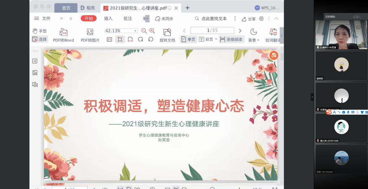 2021年9月10日上午9时,WilliamHill中文官方网站在线上开展了2021级研究生新生心理健康讲座。学生心理健康教育与咨询中心孙笑澄老师就“积极调试,塑造健康心态”主题为新生们针对研究生阶段可能遇到的心理问题提出了应对方法。