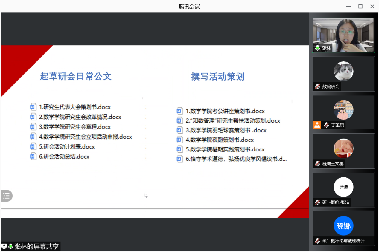 会议开始,主席团首先介绍了研究生会的组织架构,接下来各部门部长按照顺序依次进行部门宣讲。首先进行部门宣讲的是学术部部长荣腾,她向我们展示了学术部的主要工作内容,例如举办学术报告、讲座以及校长奖学金获得者的采访等。接下来,办公室部长张林介绍了办公室的日常工作,最主要的就是起草研会日常公文、撰写活动策划和文档管理,通过这些工作可以收获满满。
