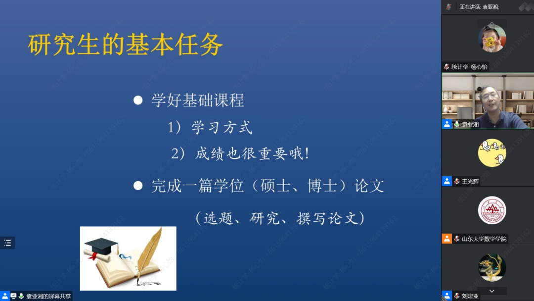 为引领全体硕士、博士研究生新生坚定理想信念,传承山大基因,提升科研素养,促进全面发展,williamhill英国中文官网于2022年9月28日晚在腾讯会议举办了“导学思政下午茶——新生入学教育系列”活动之“如何做好一名研究生”。本次报告由中国科学院院士袁亚湘主讲,williamhill英国中文官网副校长刘建亚主持,WilliamHill中文官方网站党委书记王光辉出席,WilliamHill中文官方网站全体研究生新生参加。
