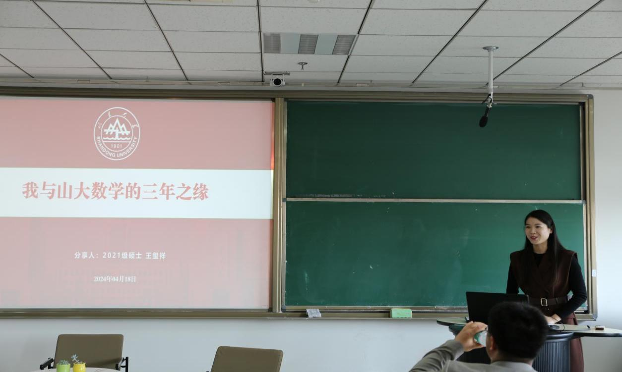 最后,王玺祥同学做了“我与山大数学的三年之缘”专题分享。结合自己在学习方面积极求教、勇于尝试、不断奋进的成长历程和在工作方面多学多看、挑战自我、总结复盘的经验心得,王玺祥同学勉励同学们扎根沃土,向上生长,坚信奋斗的泪泉和牺牲的血雨终将是成功者的“通行证”。