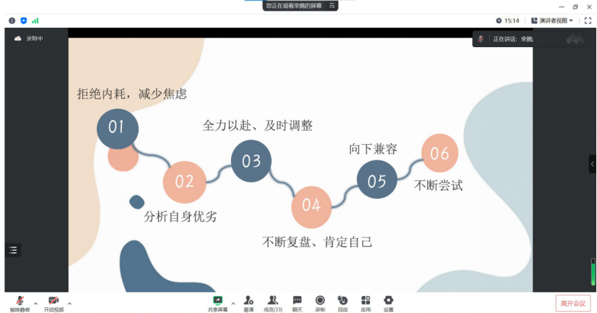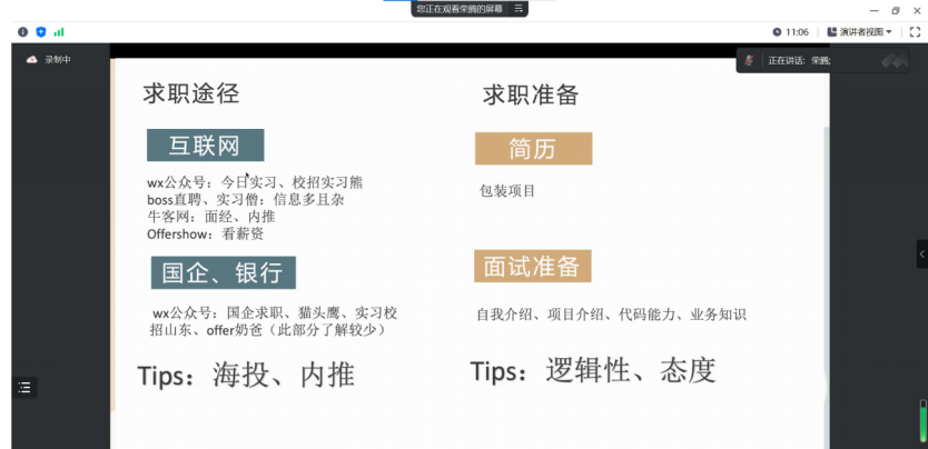 荣腾、高剑、钱辰、宁春辉、朱殷欣、邢晓莉六位毕业生从实习经历、求职途径、求职准备等方面出发,分享了自己在求职阶段的成长历程、面临的挑战和解决方法。他们建议2022级有意工作的同学积极行动,提前了解就业信息,多积累实习经验,不断在实战中增加自信,注重自身能力的提升,厚积薄发,为最终的就业做好最充足的准备!与此同时,也要学会调整心态,求职之路并非一帆风顺,要学会适当缓解压力,关注当下,为所当为。