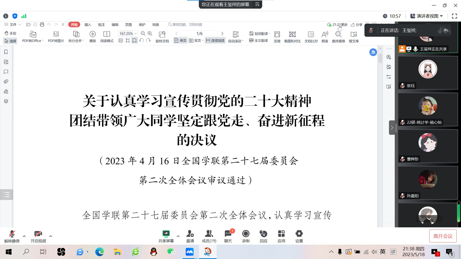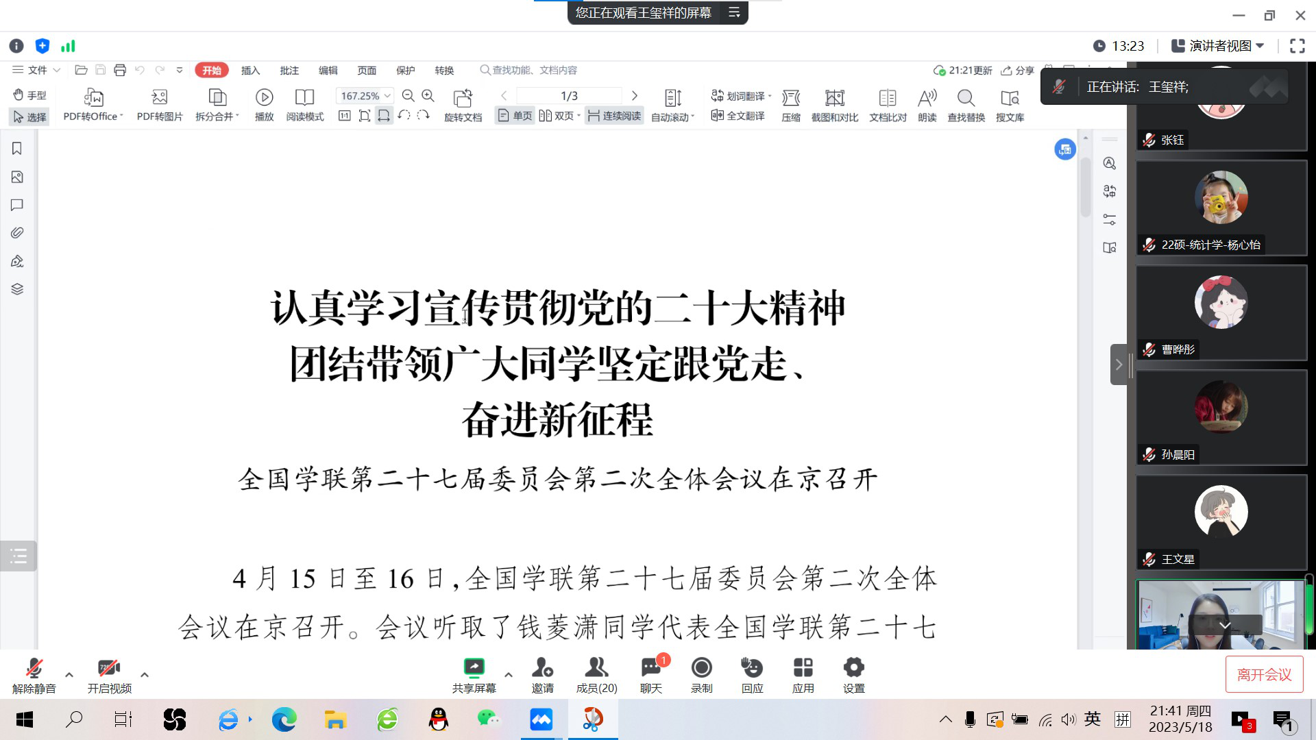 通过会议,认真学习了党的二十大精神,作为研究生会的一员,我将坚持用习近平新时代中国特色社会主义思想武装头脑、指导实践、推动工作,引领广大同学深刻领悟“两个确立”的决定性意义,增强“四个意识”、坚定“四个自信”、做到“两个维护”,与党同心、跟党奋斗,在全面建设社会主义现代化国家的进程中书写青春篇章、贡献青春力量!