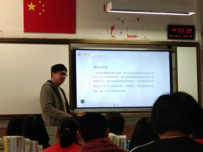 2018级的朱峰同学利用寒假时间重返母校,看望昔日老师和学弟学妹。通过对学杂费、生活费与各项奖助学金的金额进行比较,他告诉学弟学妹“学校不会因为经济问题而放弃每一位优秀的人才”。朱峰还以身边优秀的学长学姐为例介绍了勤工助学和添翼工程对学生综合素质方面的提升,鼓励同学们在大学全面发展。最后,他还介绍了我校的“解忧杂货铺”,以此帮助大家树立自信,减少焦虑。