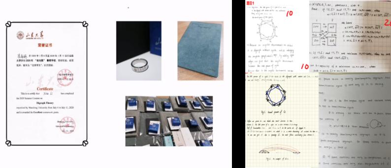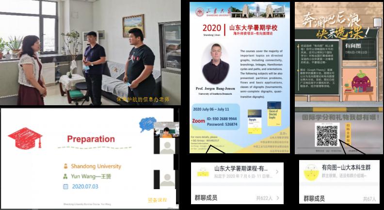 学校信息化办公室的同志们特地亲临现场指导,并在整个课程期间耐心解答我们遇到的各种问题,为课程顺利进行提供了支持。值得一提的还有课程团队成员--王赟、张婕、江素云。她们多次测试Zoom平台以及通讯网络,设置各种预案,制作宣传海报,缜密的筹划使整个课程得以顺利进行,得到了师生的高赞。为了方便交流和及时地信息共享,她们组建QQ交流群、微信群。为方便因时间冲突不能按时上课的同学们,她们专门录制了课程视频。视频的剪辑、转录、上传等是琐细的工作,她们几次因此工作到深夜一两点钟。为给参加课程的本科生普及基础知识,王赟在正式课程前对有向图的一些基本概念及性质进行了讲解。张婕和江素云针对选修此课程的山大本科生设计了学习方案,课程期间一丝不苟批改作业,耐心细致答疑。