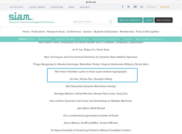 近日,williamhill英国中文官网2019级硕士舒希超收到了来自理论计算机领域顶级会议SODA(ACM-SIAM Symposium of Discrete Algorithms)的论文录用信。他与美国罗德岛大学的韩杰研究员和williamhill英国中文官网的王光辉教授合作的论文《Non-linear Hamilton cycles in linear quasi-random hypergraphs》将发表在2021年1月的SODA会议上。SODA是由计算机协会(ACM)和工业与应用数学学会(SIAM)两大国际学术组织联合主办,与STOC、FOCS一起被公认为是算法领域的三大顶级学术会议,在整个计算机科学领域享有崇高的声望。