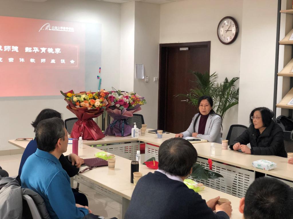 王妍和吕同老师回顾了自己从教40余年的经历,表达了对教育教学工作的热爱,对青年学生朝气蓬勃精神的喜爱之情,回忆了教学经历中感人的细节,吕同老师还谈到青岛校区教学工作中的情况,令在座老师们深受感动。两位老师都是WilliamHill中文官方网站应用数学研究所的教师,在长时间的教育教学工作中与所里老师们互帮互助,共同研讨,产生了深厚的工作友谊。研究所所长蒋晓芸老师和支部书记金辉老师代表研究所感谢两位老师热情奉献,青年老师们也纷纷表示要向两位老师学习,安心从教,潜心钻研。