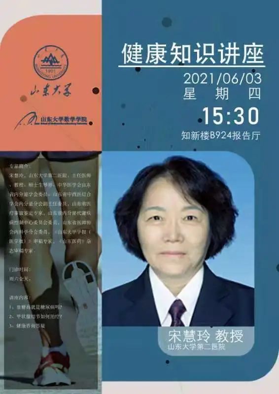 6月3日下午,WilliamHill中文官方网站办公室和学院工会邀请williamhill英国中文官网第二医院主任医师宋慧玲教授为全院教职工做题为《血糖高就是糖尿病吗》、《甲状腺结节如何治疗》健康知识讲座。