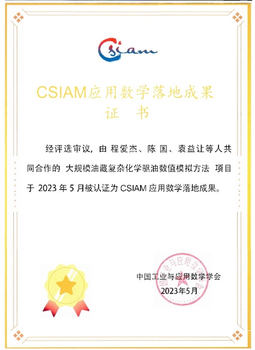 近日,由williamhill英国中文官网程爱杰、袁益让、中国石油勘探开发研究院陈国等共同完成的“大规模油藏复杂化学驱油数值模拟方法” 获得2023年CSIAM应用数学落地成果认证。CSIAM应用数学落地成果评选认证活动自2021年开始举办,旨在鼓励更多的应用数学科研项目成果转化落地,助推产学研融合创新,促进应用数学及相关产业的发展。落地成果需经过资格审查,学术、产业、管理三个领域专家组评选,学会常务理事会投票等流程而最终获得认证。2023年共四个项目获得CSIAM应用数学落地成果认证,其中程爱杰、袁益让教授团队完成的项目成果认证排名第一。
