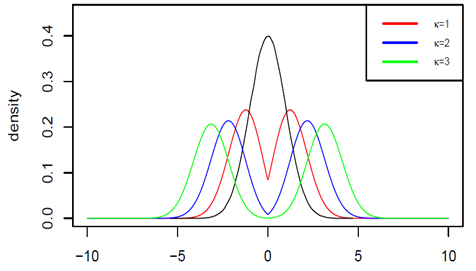 和效用函数的单调性,当k<0时,该线性正态分布呈针状分布形态(下图一);当k>0时,该非线性正态分布呈双峰分布形态(下图二);当k=0时,该非线性正态分布退化为经典正态分布。