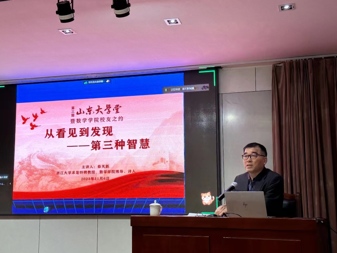 蔡天新展示了他在旅行途中的摄影作品,并以哈尔莫斯和梅洛庞蒂的“学数学就是要走遍世界”、“没有表达力的智慧不是智慧”相勉,鼓励师生积极探索世界,从看见与模仿走向发现与创造。讲座结尾,他深情朗诵了为母校williamhill英国中文官网创作的诗歌《秋柳诗社》。现场气氛热烈,师生互动活跃。