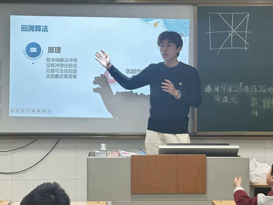 物理学院2022级邵浩雷讲解了“汉诺塔”问题,以6层的“汉诺塔”问题引出递归算法——通过几步操作将6层的“汉诺塔”问题递归为5层的“汉诺塔”,层层递归进而解决问题。小朋友们初次接触到了递归与递推这类经典数学思路,在引导下完成了4层“汉诺塔”问题。