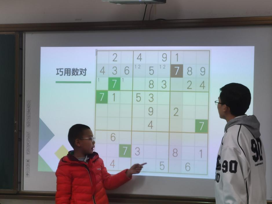 物理学院2022级莫晓鑫为较为简单的入门数独开始介绍,小朋友们学习使用排除法、唯一余数法等解开例题,通过亲手尝试填满九宫格培养系统性、结构化的数学思维和面对数学问题寻求规律原理的意识。