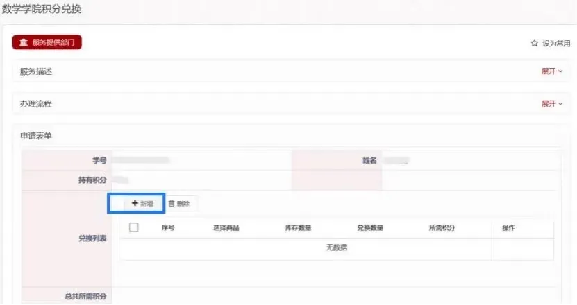 williamhill英国中文官网信息化公共服务平台——右下角“常用应用”中找到“学院信息服务”——学院信息服务工作台——“学院服务”——“积分兑换申请”——“新增”,然后选择自己想要的商品名称,确定后就可以显示商品的种类和库存。