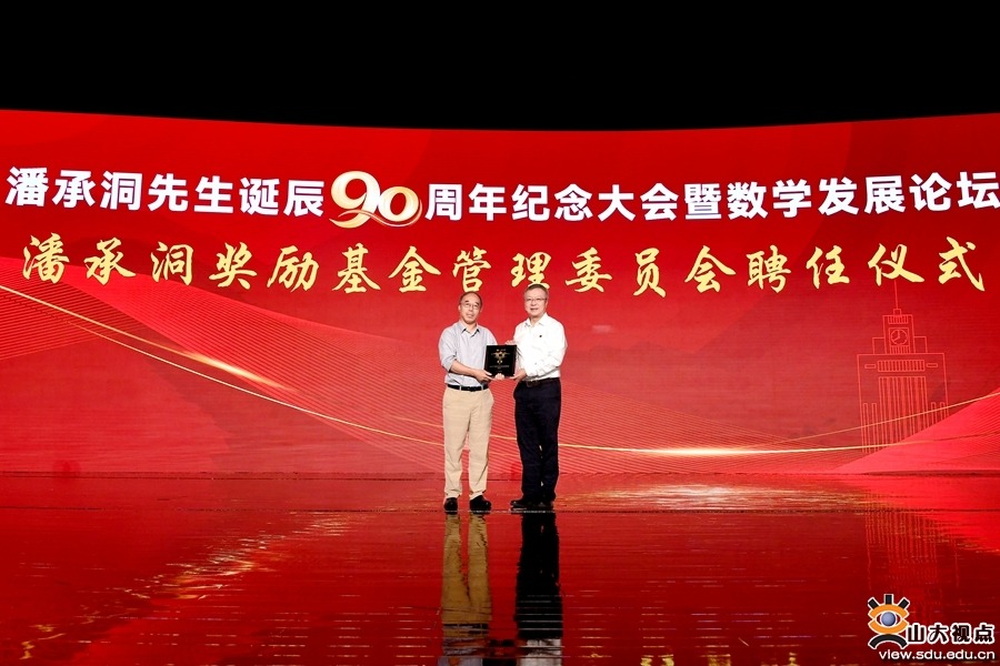 会上举行了潘承洞奖励基金管理委员会聘任仪式,任友群为焦震颁发委员会副主任聘书。焦震分享了自己在山大与数学结缘的经历,表示将持续关心和支持数学研究和学校事业发展,希望基金激励师生投身数学基础研究,在数学应用及相关领域提出更高目标、实现更多突破、取得更好成绩、作出更大贡献。