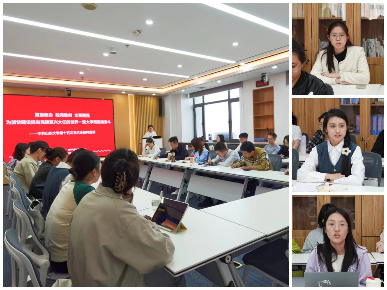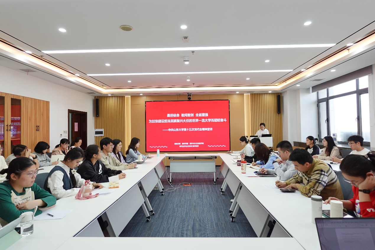 在讨论环节,王自然以如何“勇担使命、敢闯敢创”、如何将国家重大战略融合到自己的学术目标中、学生党员如何贯彻落实党代会精神等方面进行了提问。她强调,各位党员同志要结合自身经历,从不同角度、以不同身份理解体会学校第十五次党代会报告擘画的宏伟蓝图,将个人发展与学校发展、国家发展有机结合在一起,抢抓机遇、全面图强,加快学校“双一流”建设做出自己的贡献。戚学儒认为,青年是国家和民族的希望,是山大的未来,学校第十五次党代会与每一位党员同志、每一位师生医务员工息息相关。希望在座同学们务必不忘初心、牢记使命,务必谦虚谨慎、艰苦奋斗,务必敢于斗争、善于斗争,弘扬党的光荣传统和优良作风,不断增强做中国人的志气、骨气、底气,奋力书写为中国式现代化挺膺担当的青春篇章。期间,与会党员聚焦学习内容,结合自身实际提出了问题,各位老师进行详细解答。