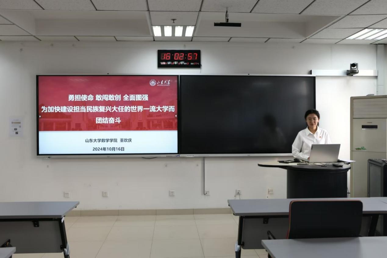 中国共产党williamhill英国中文官网第十五次党员代表大会,是在中国式现代化开启新征程、教育强国建设吹响新号角、学校事业发展迈上新起点的关键时刻召开的一次十分重要的会议。董欢庆详细解读大会主题,回顾学校第十四次党代会以来取得的发展成就,详细解读学校新时代新征程建设“一五七九”战略部署,传达坚定不移地抓好全面图强“九大任务”等大会重要思想。她表示,主题是报告的灵魂,承载着学校未来的发展方向,彰显williamhill英国中文官网作为国家高等教育的重要使命,呼吁党员同学充分发挥党员先锋模范作用,增强理想信念,脚踏实地,努力奋斗,积极响应国家重大战略需求,将个人理想融入学校事业发展和国家发展需要,努力培养堪当民族复兴重任的时代新人。