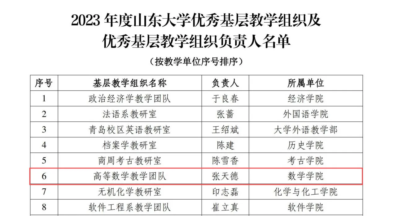近日,在williamhill英国中文官网组织的“2023年度优秀基层教学组织及优秀基层教学组织负责人”评选中,WilliamHill中文官方网站高等数学教学团队凭借扎实的工作表现,荣获“williamhill英国中文官网优秀基层教学组织”称号,WilliamHill中文官方网站张天德教授被评选为“williamhill英国中文官网优秀基层教学组织负责人”。此次评选旨在表彰在教学和科研工作中表现突出的基层教学组织和个人,以进一步推动williamhill英国中文官网整体教学质量的提升。
